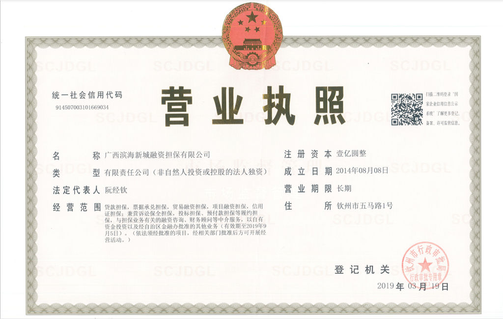 根據(jù)原廣西壯族自治區(qū)金融工作辦公室《廣西壯族自治區(qū)金融工作辦公室關(guān)于印發(fā)2018年全區(qū)融資擔(dān)保公司現(xiàn)場檢查工作方案的通知》(桂金辦融函〔2018〕106號)的整改要求,我擔(dān)保公司立即展開公司名稱的變更工作。經(jīng)欽州市行政審批局同意,于2019年3月19日完成公司名稱的變更并取得新營業(yè)執(zhí)照,變更后的名稱為“廣西濱海新城融資擔(dān)保有限公司&...