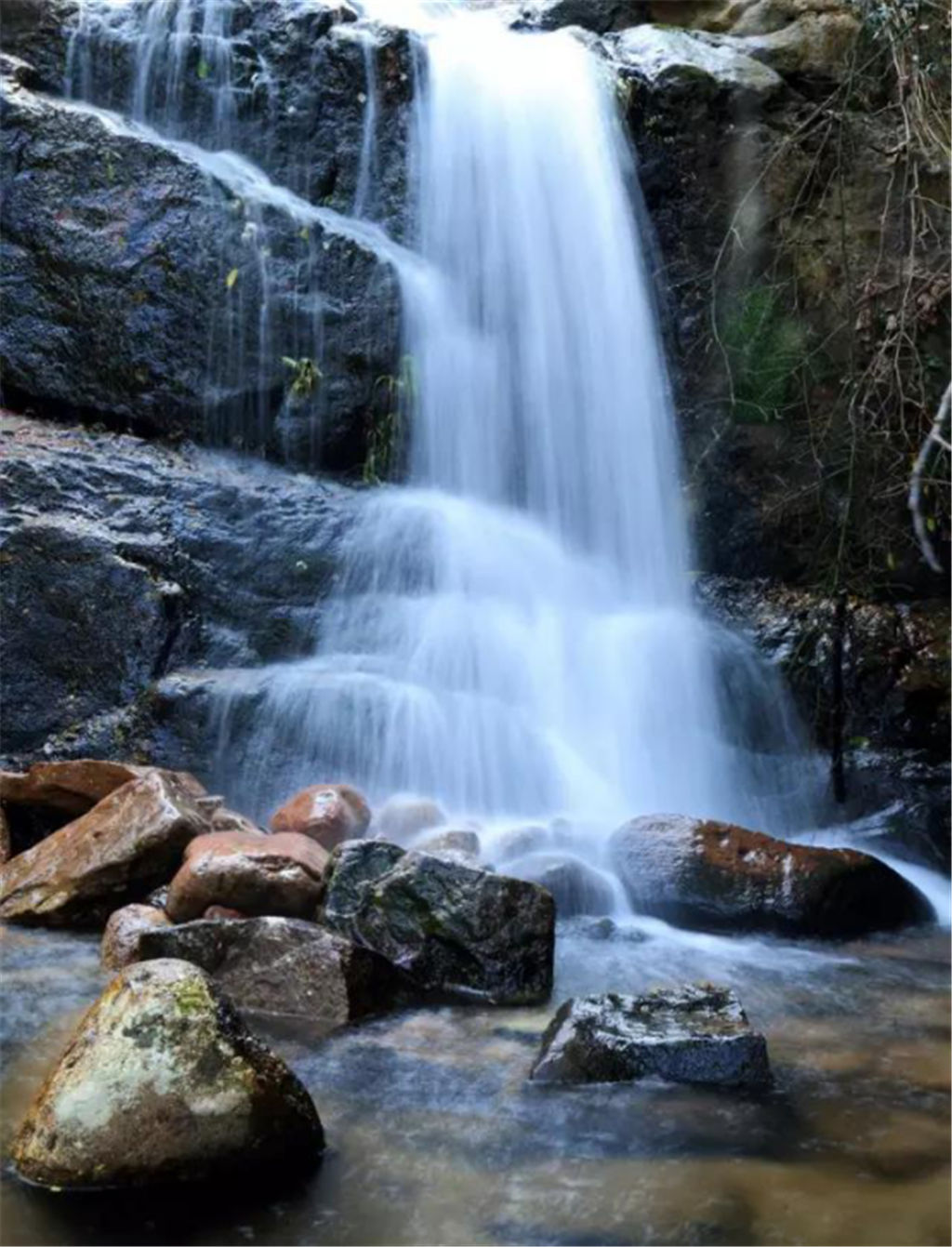 豐水期,遠(yuǎn)遠(yuǎn)的未見其水,便聞其聲,隆隆的水聲如雷鳴般響徹山谷,清澈的山泉水順著山勢(shì)歡快地奔騰而下,水流沖落在瀑布下的巖石上,飛濺起粒粒的水珠,銀白閃亮,就像晶瑩的珍珠正在翻滾跳躍。