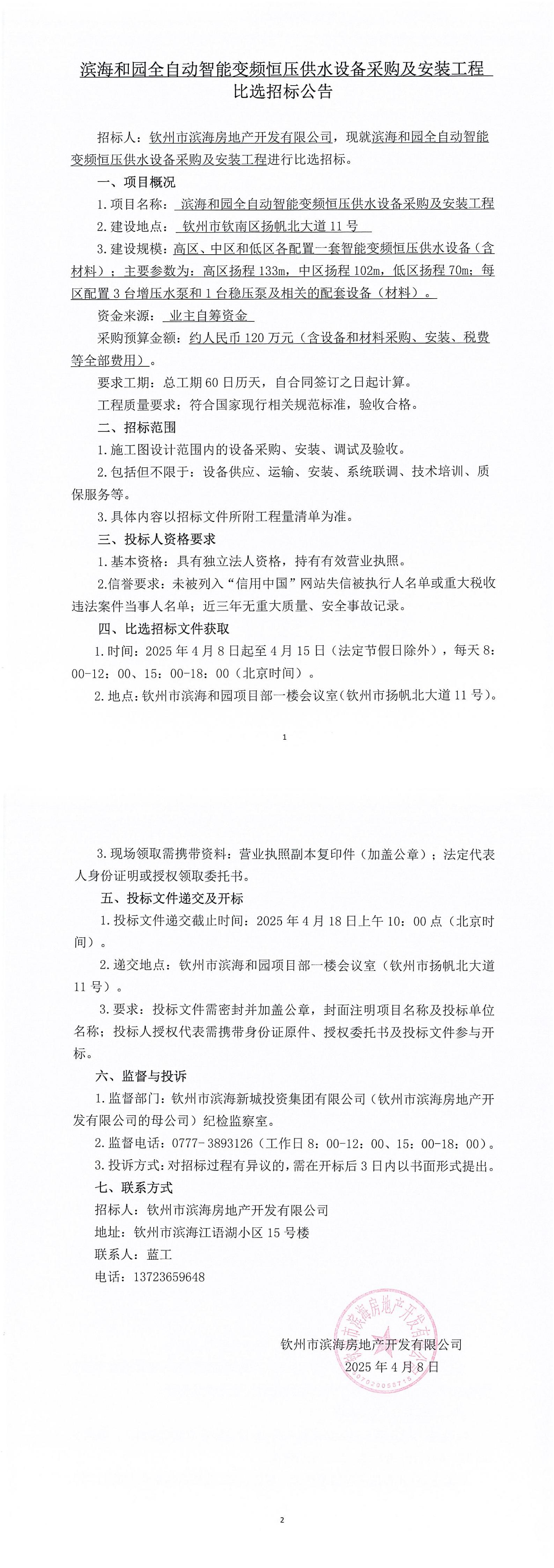 濱海和園全自動智能變頻恒壓供水設(shè)備采購及安裝工程比選招標(biāo)公告