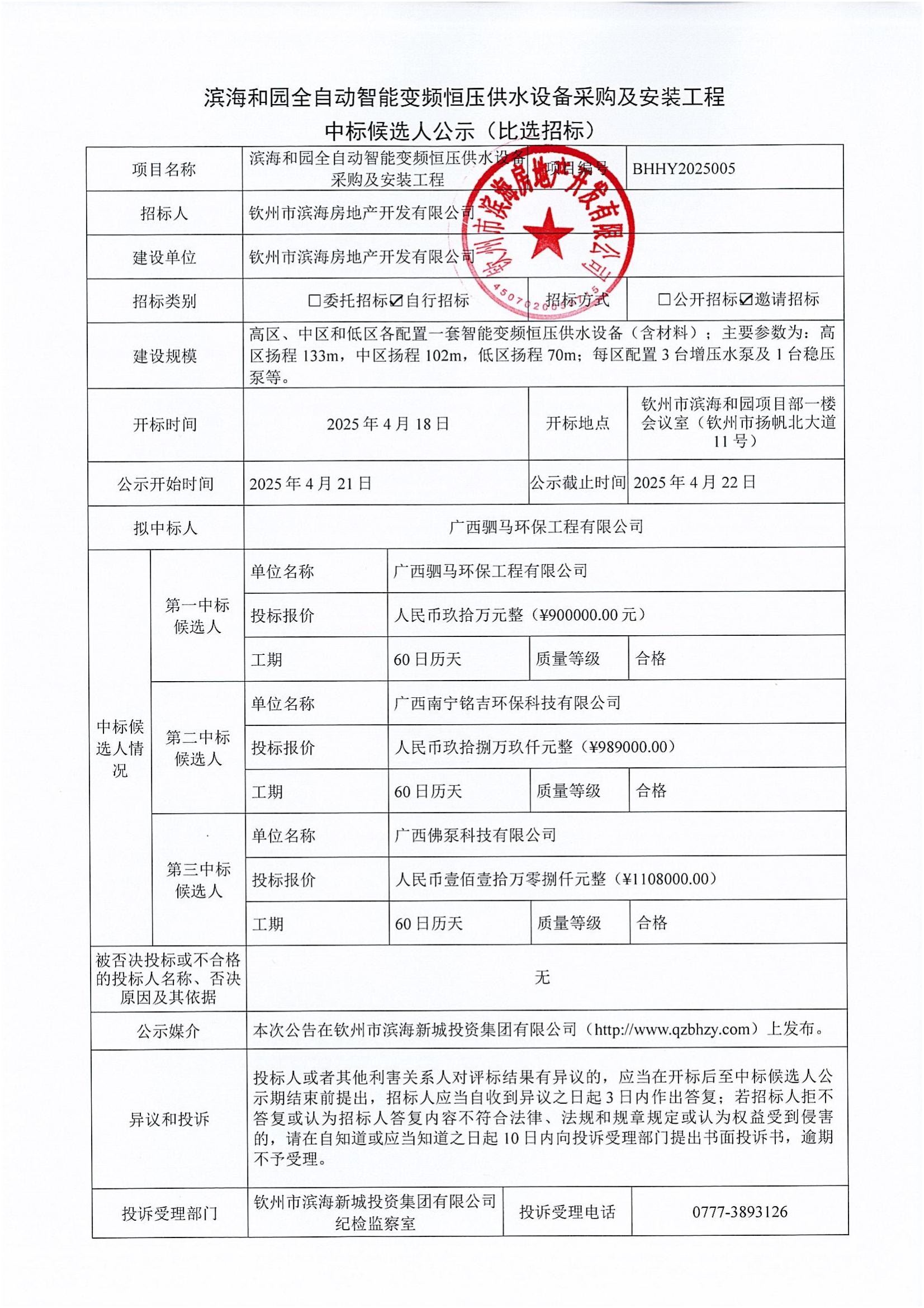濱海和園全自動智能變頻恒壓供水設(shè)備采購及安裝工程中標(biāo)候選人公示(比選招標(biāo))