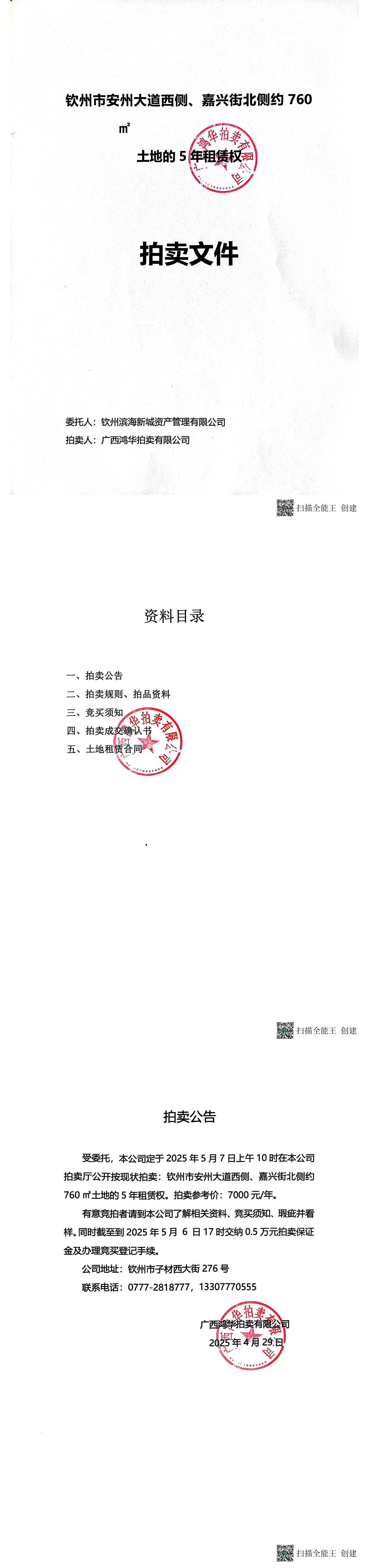 欽州市安州大道西側(cè)、嘉興街南北側(cè)約760㎡土地的5年租賃權(quán)拍賣文件