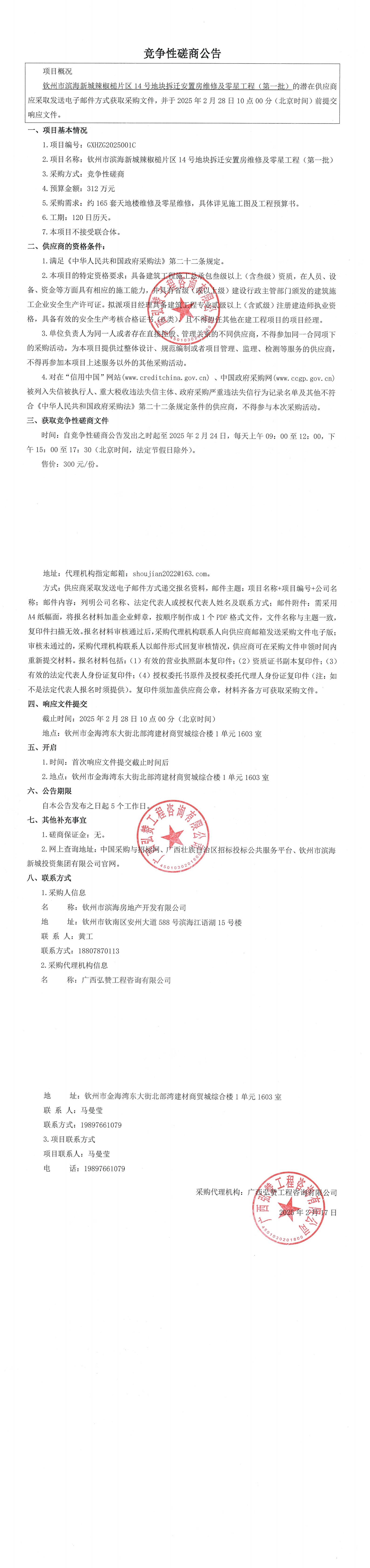 欽州市濱海新城辣椒槌片區(qū)14號地塊折遷安置房維修及零星工程(第一批)競爭性磋商公告