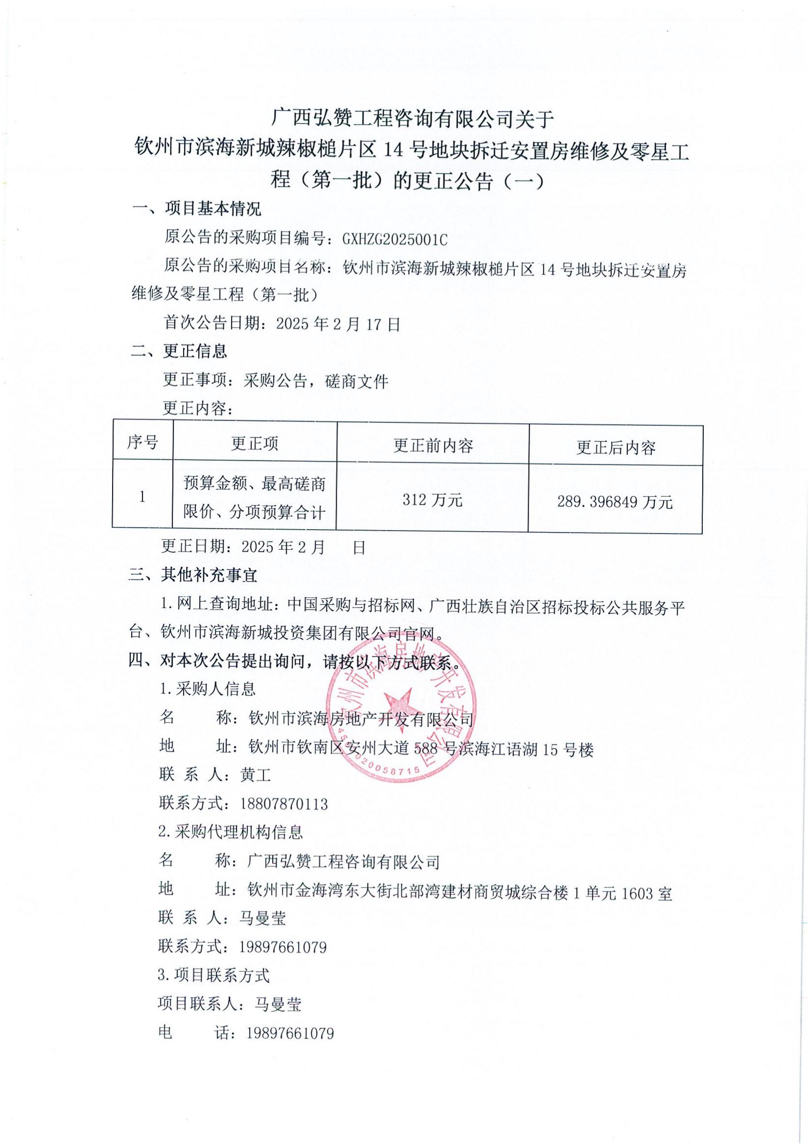 欽州市濱海新城辣椒槌片區(qū)14號地塊拆遷安置房維修及零星工程(第一批)的更正公告