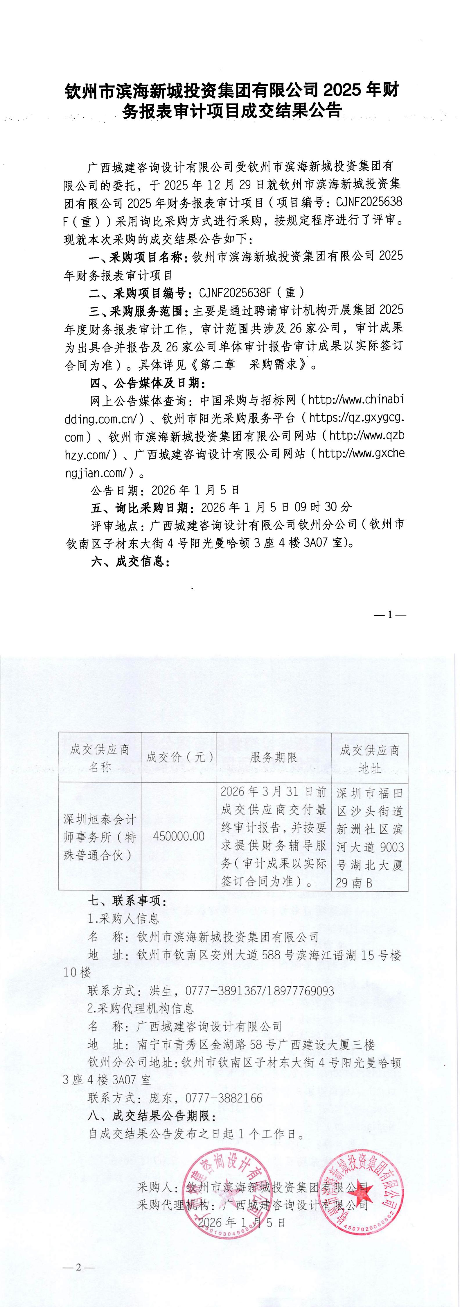 欽州市濱海新城投資集團(tuán)有限公司2025年財務(wù)報表審計項(xiàng)目成交結(jié)果公告