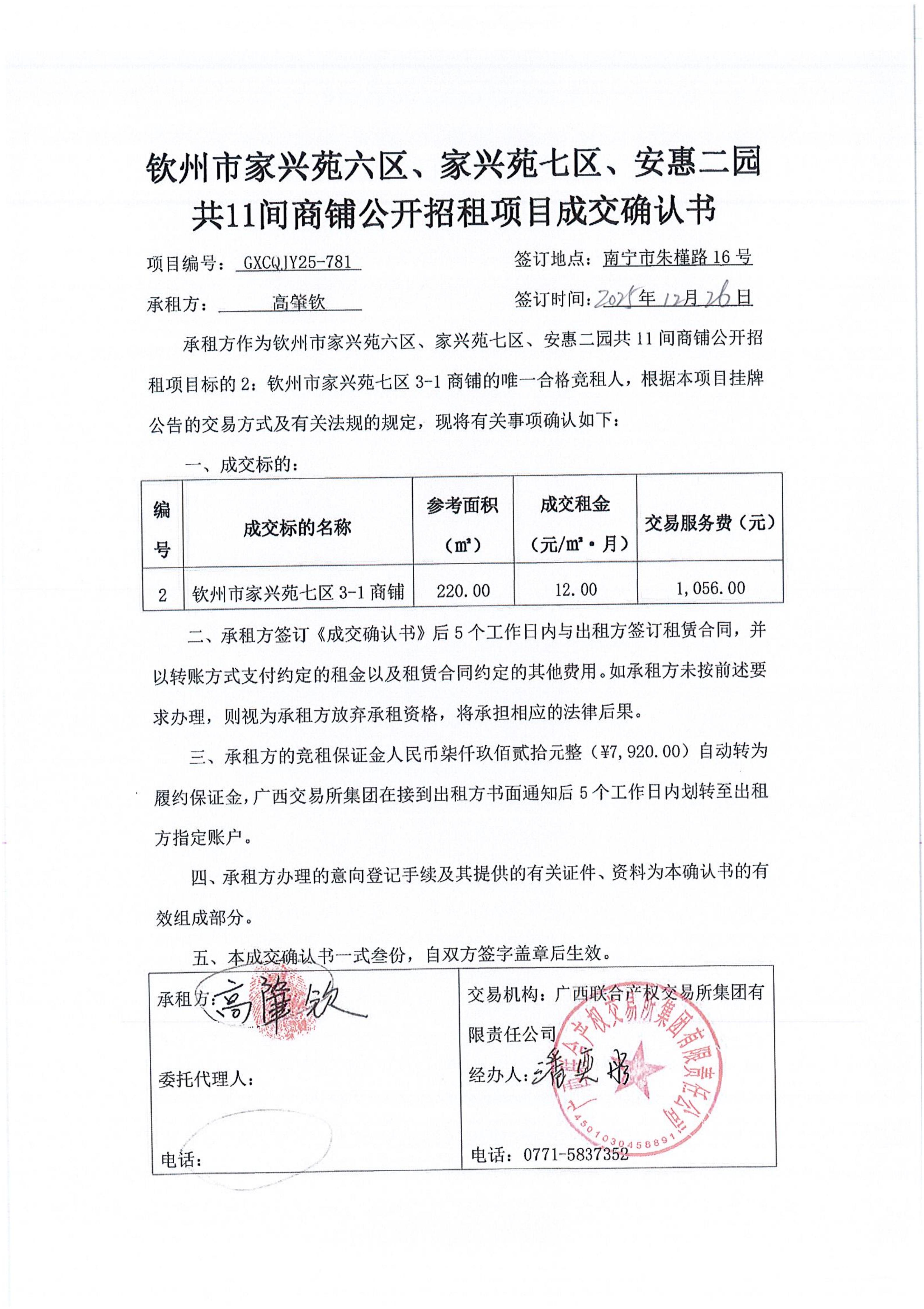 欽州市家興苑七區(qū)3-6號商鋪公開招租項目 成交確認(rèn)書