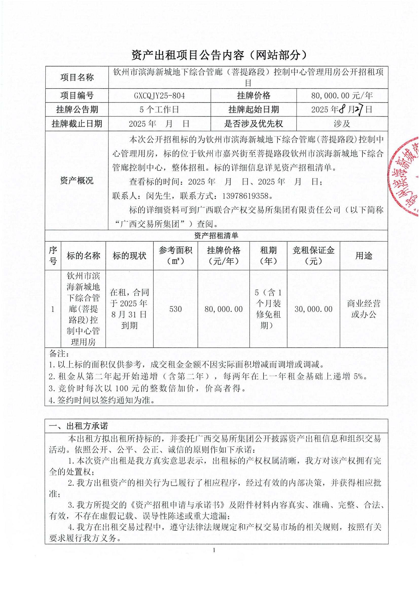 欽州市濱海新城地下綜合管廊(菩提路段)控制中心管理用房公開招租項目