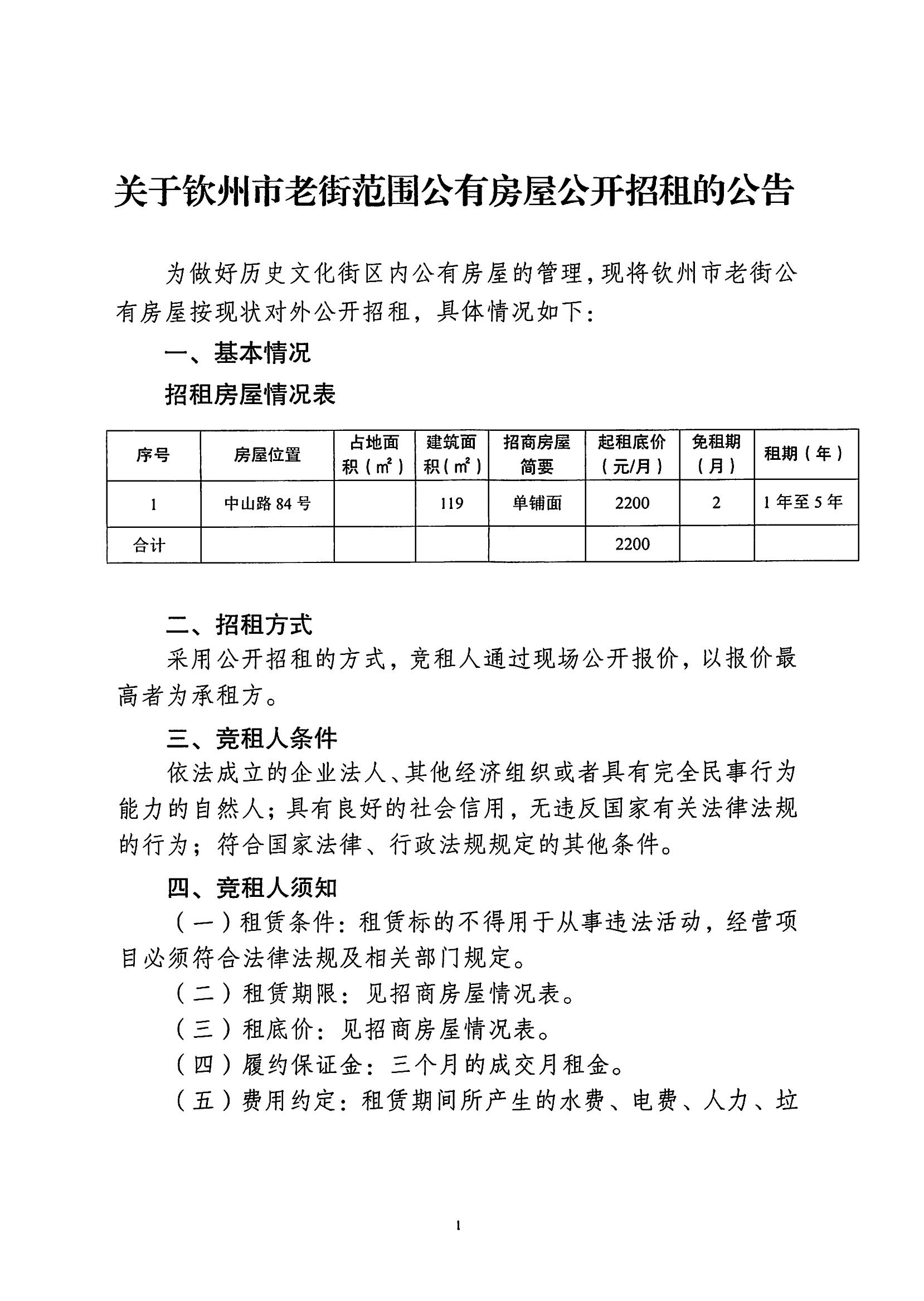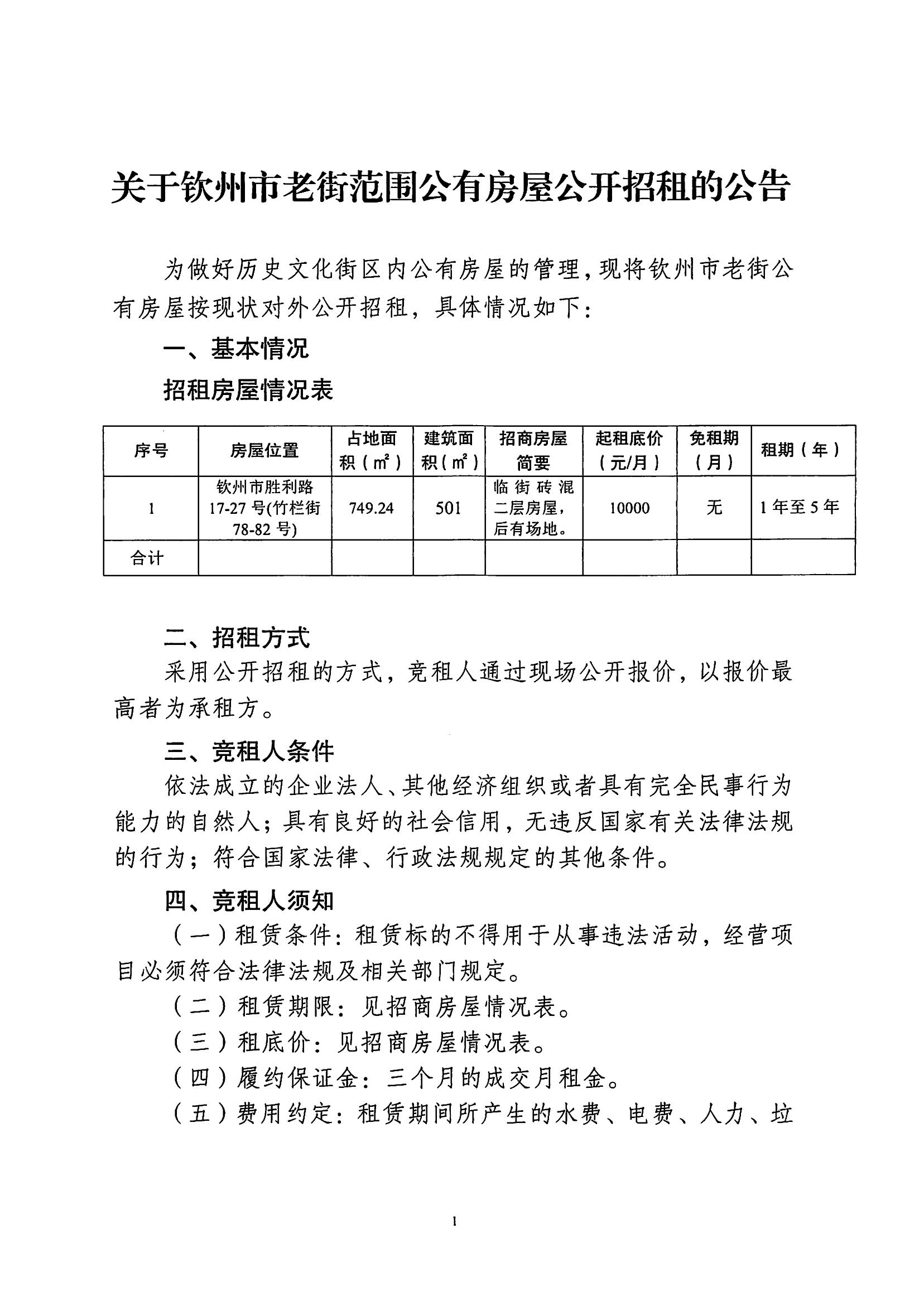 欽州市濱海文化旅游投資有限公司關于欽州市老街范圍1處房屋公開招租結果公...