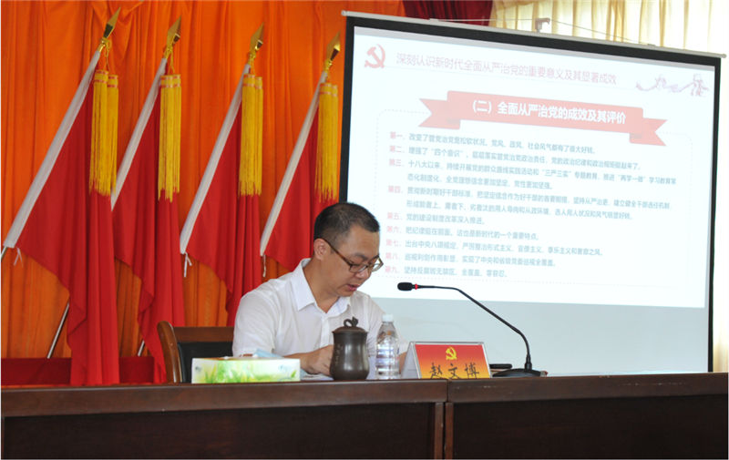 為推動(dòng)落實(shí)《黨委(黨組)落實(shí)全面從嚴(yán)治黨主體責(zé)任規(guī)定》,按照市委深入學(xué)習(xí)貫徹黨中央和自治區(qū)黨委關(guān)于全面從嚴(yán)治黨各項(xiàng)部署要求,6月22日下午,集團(tuán)公司黨委書記趙文博同志以《積極推動(dòng)全面從嚴(yán)治黨向縱深發(fā)展》為主題,講了一堂生動(dòng)的全面從嚴(yán)治黨專題黨課。歷時(shí)一個(gè)半小時(shí),67名黨員接受黨課教育。