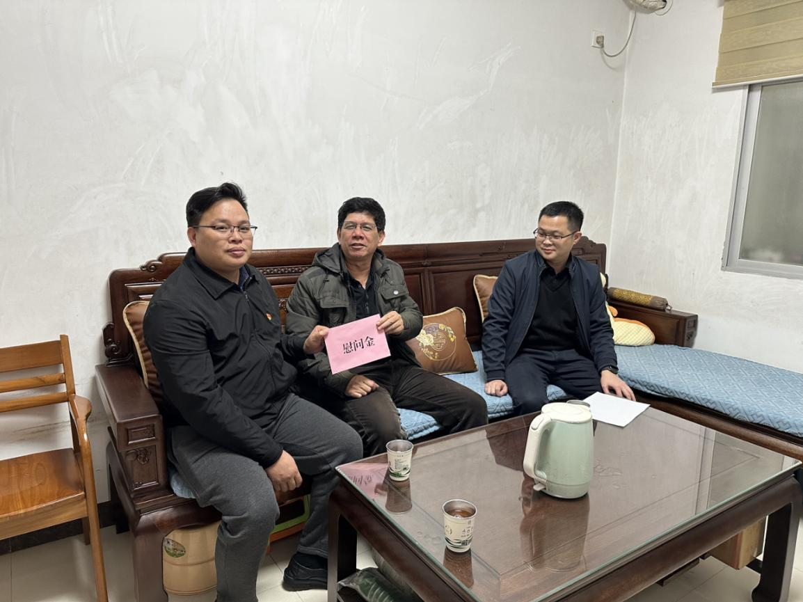 圖為碧海公司執(zhí)行董事、總經(jīng)理曹原裕(左),黨政辦副主任黃宇(右)慰問(wèn)退休干部王召同志(中)