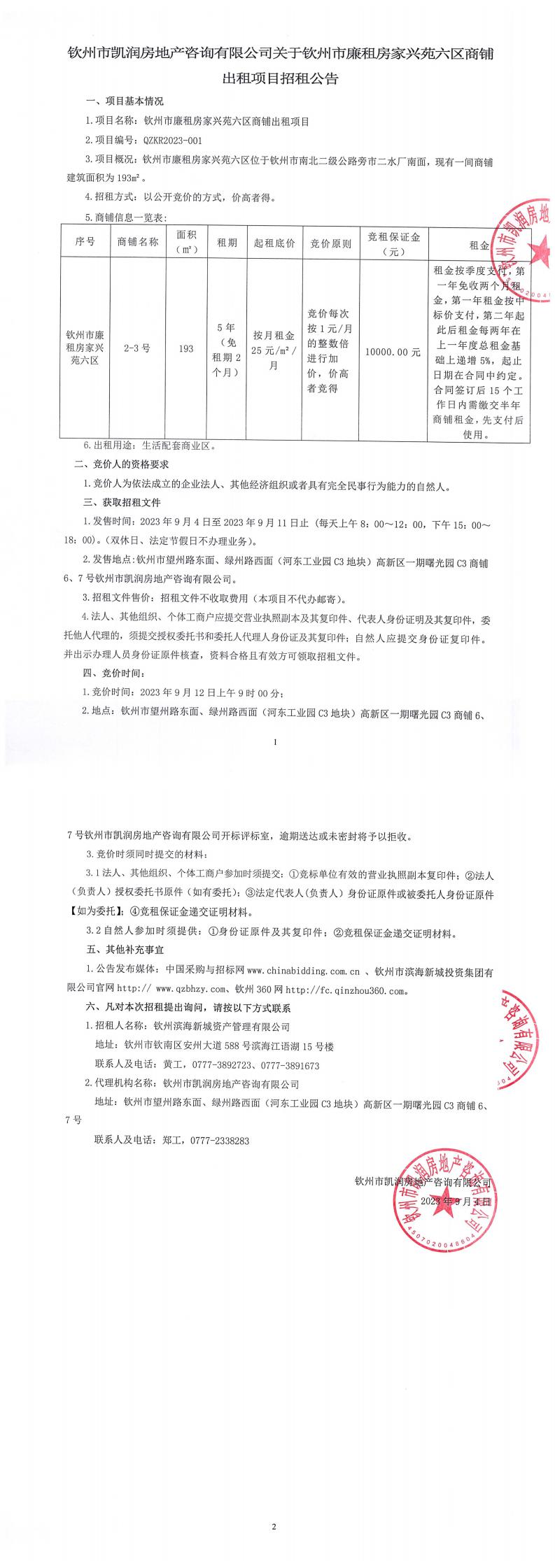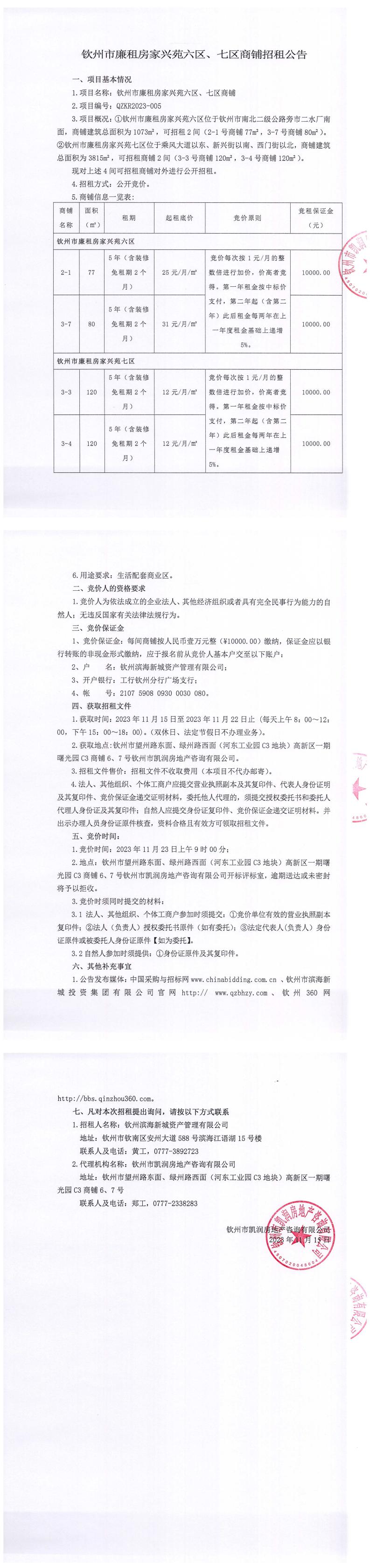 關(guān)于欽州市廉租房家興苑七區(qū)、安惠二園商鋪出租項目招租公告