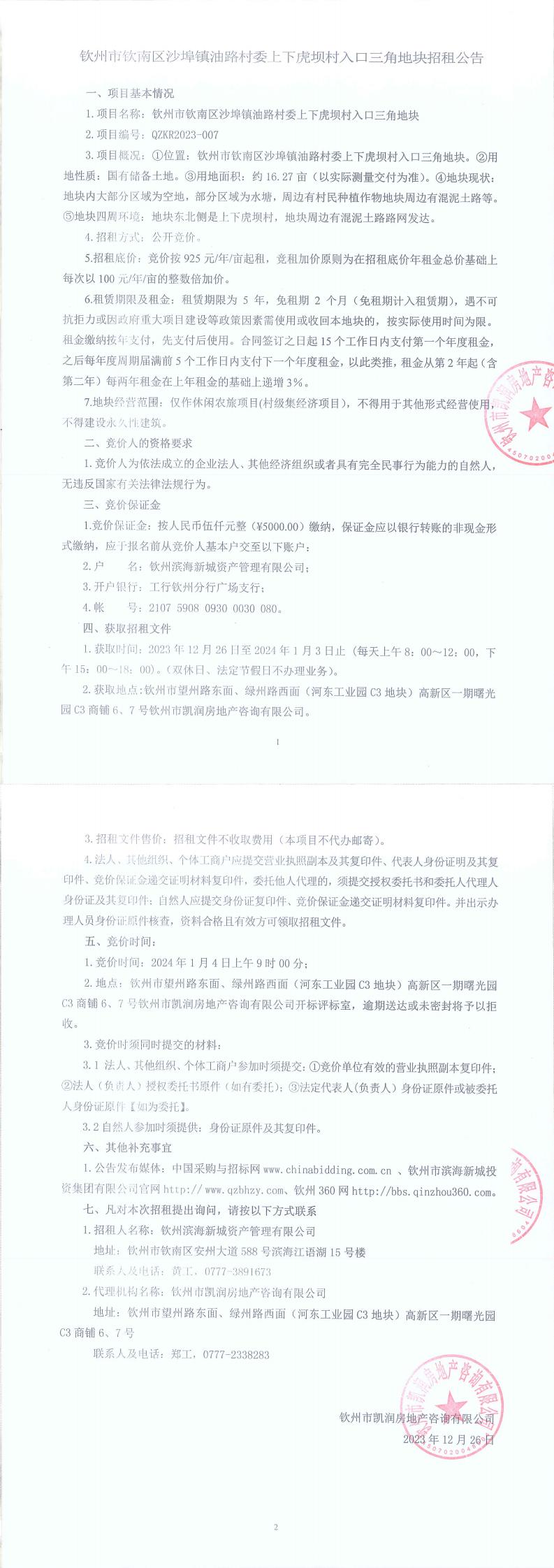 欽州市欽南區(qū)沙埠鎮(zhèn)油路村委上下虎壩村入口三角地塊招租公告