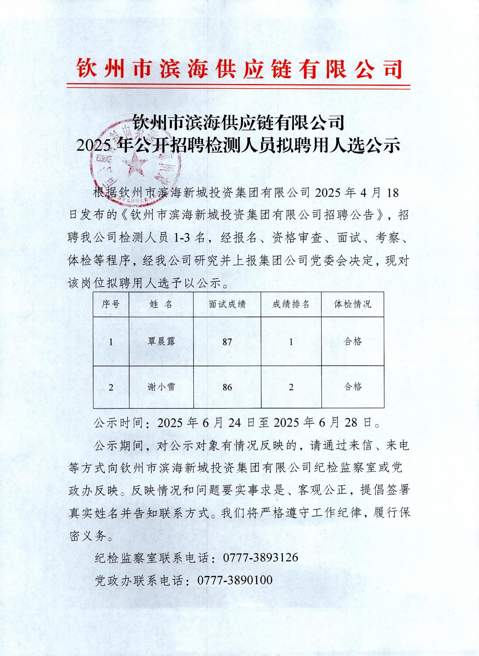 欽州市濱海供應(yīng)鏈有限公司2025 年公開招聘檢測(cè)人員擬聘用人選公示