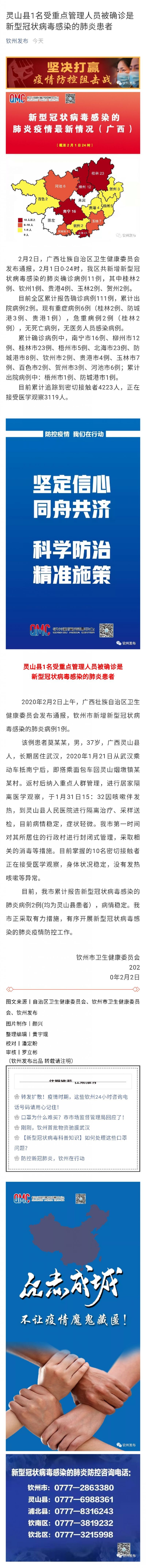 2020年1月31日欽州市新型冠狀病毒感染的肺炎疫情情況