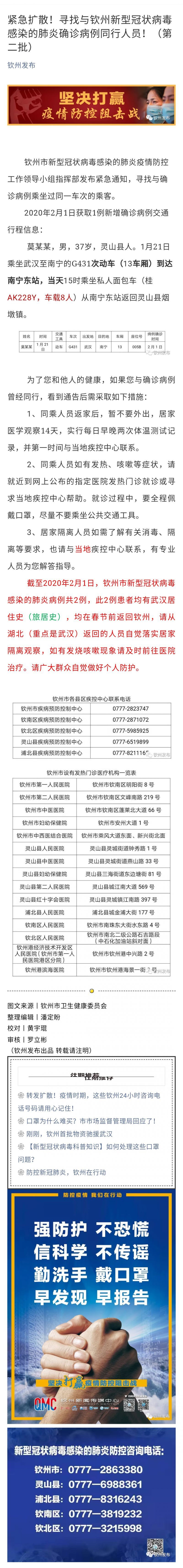 緊急擴散!尋找與欽州新型冠狀病毒感染的肺炎確診病例同行人員?。ǖ诙?/a>