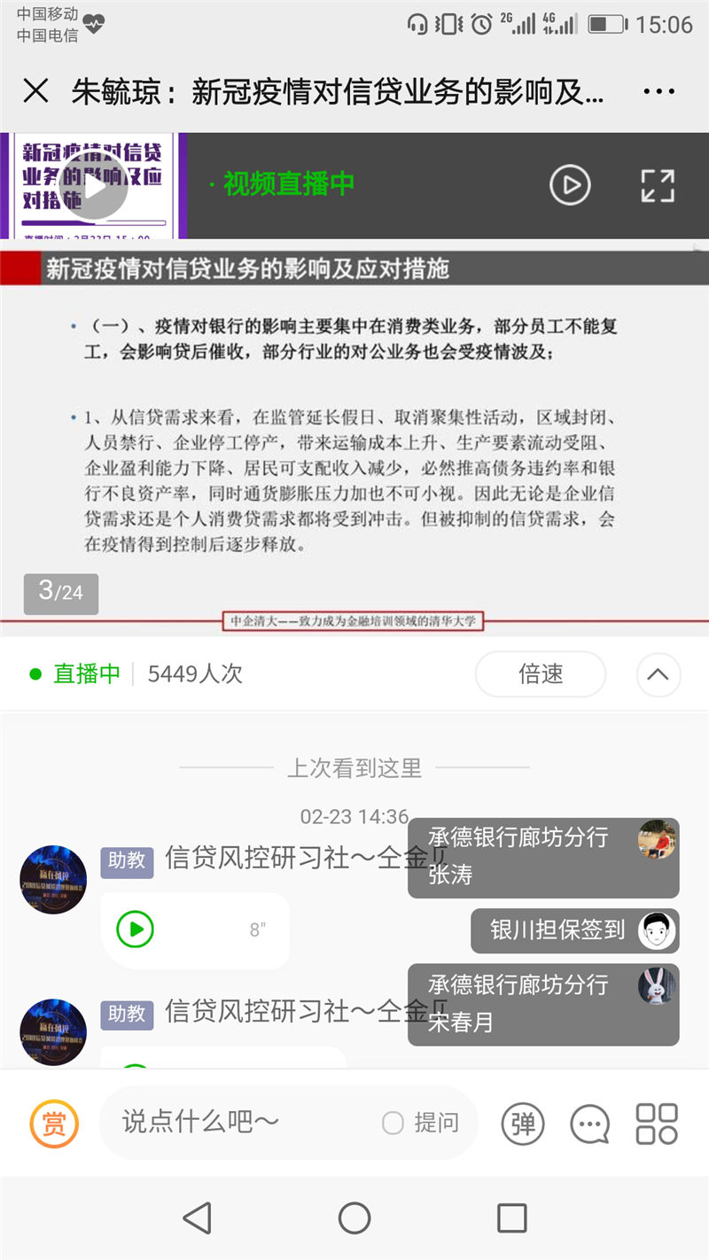 2020年2月23日下午,我公司員工集體參加銀行信貸風(fēng)險專家朱毓瓊老師主講的“新冠疫情對信貸業(yè)務(wù)的影響及應(yīng)對措施”專題網(wǎng)課。通過本次網(wǎng)課培訓(xùn),系統(tǒng)地學(xué)習(xí)了解新冠疫情對融資擔(dān)保行業(yè)的影響,充分認識本次新型冠狀病毒肺炎疫情對融資擔(dān)保行業(yè)的影響和沖擊,以及學(xué)習(xí)各地監(jiān)管部門的最新政策和應(yīng)對措施。