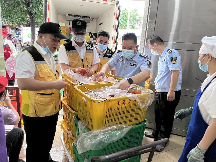 在保供工作進行中,濱海供應鏈公司始終堅持做到:一、主動接受行業(yè)主管部門的檢查,積極與市直和南北區(qū)市場監(jiān)管部門保持溝通,按要求做好質(zhì)量把控、索證索票、留樣檢測等工作;二、從“食材安全衛(wèi)生、配送安全準時”為理念,以“五保障”協(xié)議做抓手,工作人員前置農(nóng)產(chǎn)品基地和源頭供應商,確保食材質(zhì)量;三、安排食材檢測員貫徹落實索證索票工作,嚴格開展檢測工作,杜絕三無、有毒有害、過期變質(zhì)等不良品外流,對配送的食材共開展了306批次食材快檢,確保合格率達到100%;四、以黨建促業(yè)務,充分發(fā)揮黨支部戰(zhàn)斗堡壘作用,以黨員先鋒隊作為主力軍前置各考點,確保食材保質(zhì)保量以及準時到校,并配合食材檢查和驗收工作;五、充分利用食安平臺明廚亮灶系統(tǒng),有力監(jiān)控跟蹤保障食材安全配送,同時強調(diào)產(chǎn)品溯源,加強校企聯(lián)動,做好應急準備。