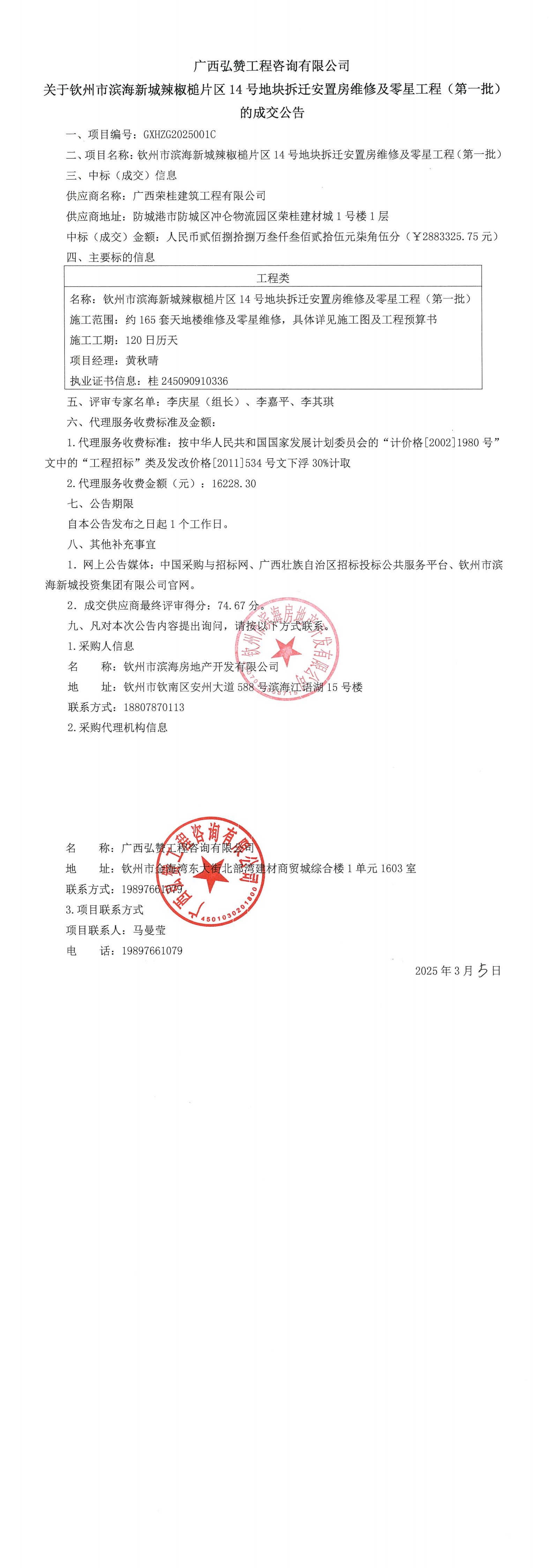 關(guān)于欽州市濱海新城辣椒槌片區(qū)14號地塊拆遷安置房維修及零星工程(第一批)的成交公告