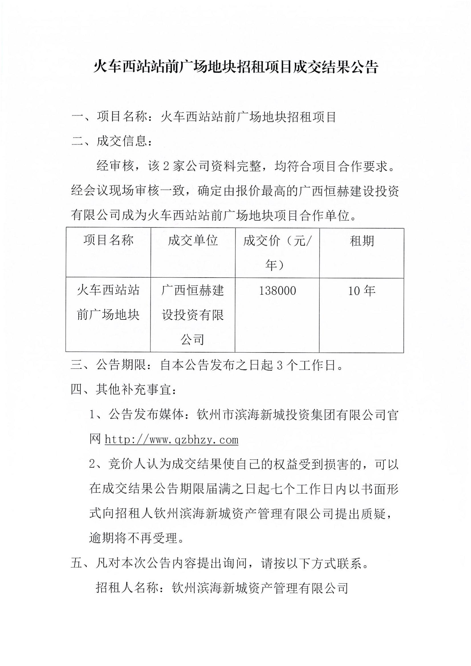火車西站站前廣場地塊招租項目成交結(jié)果公告