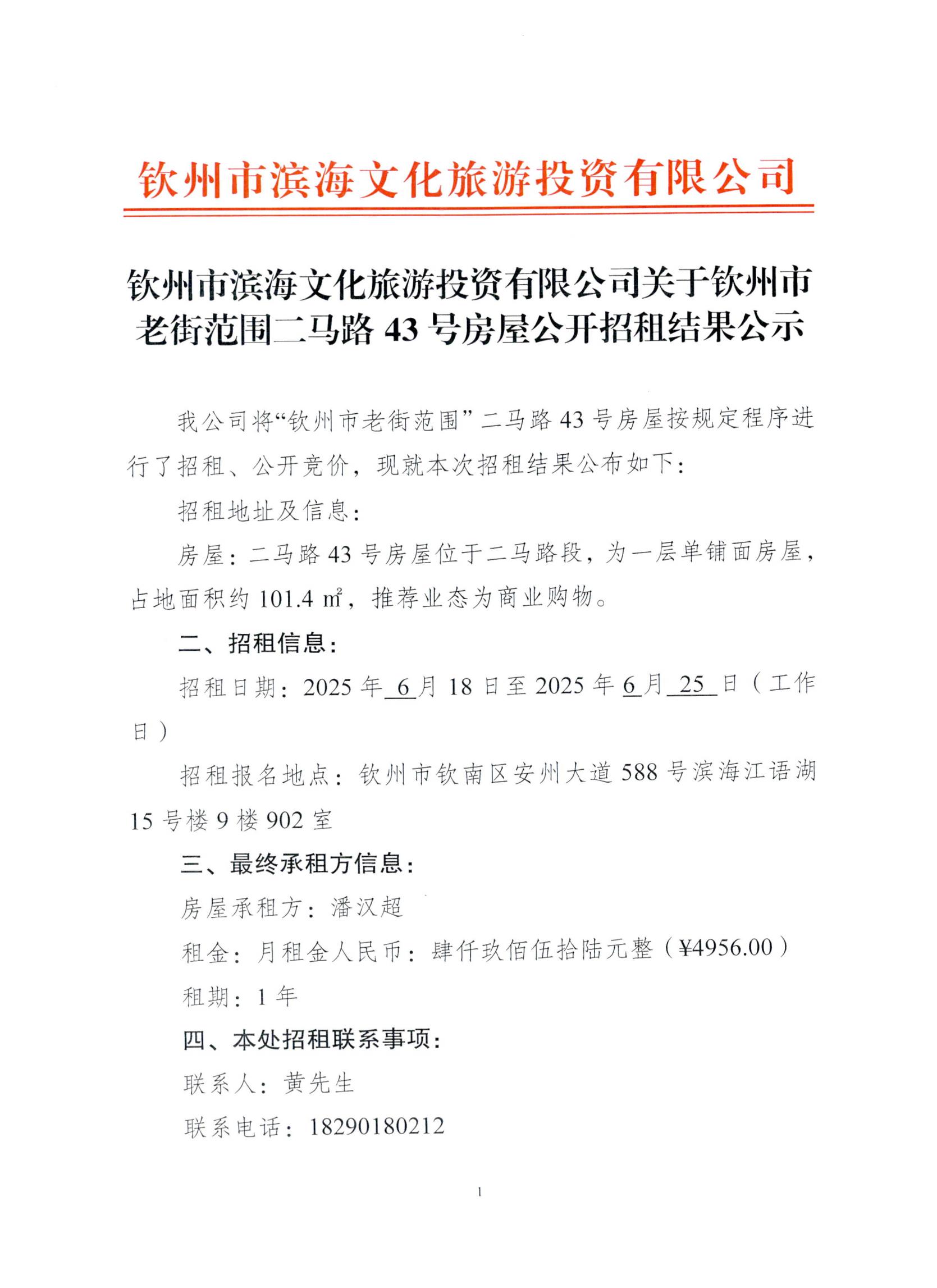 欽州市濱海文化旅游投資有限公司關(guān)于欽州市老街范圍二馬路43號房屋公開招租結(jié)果公示