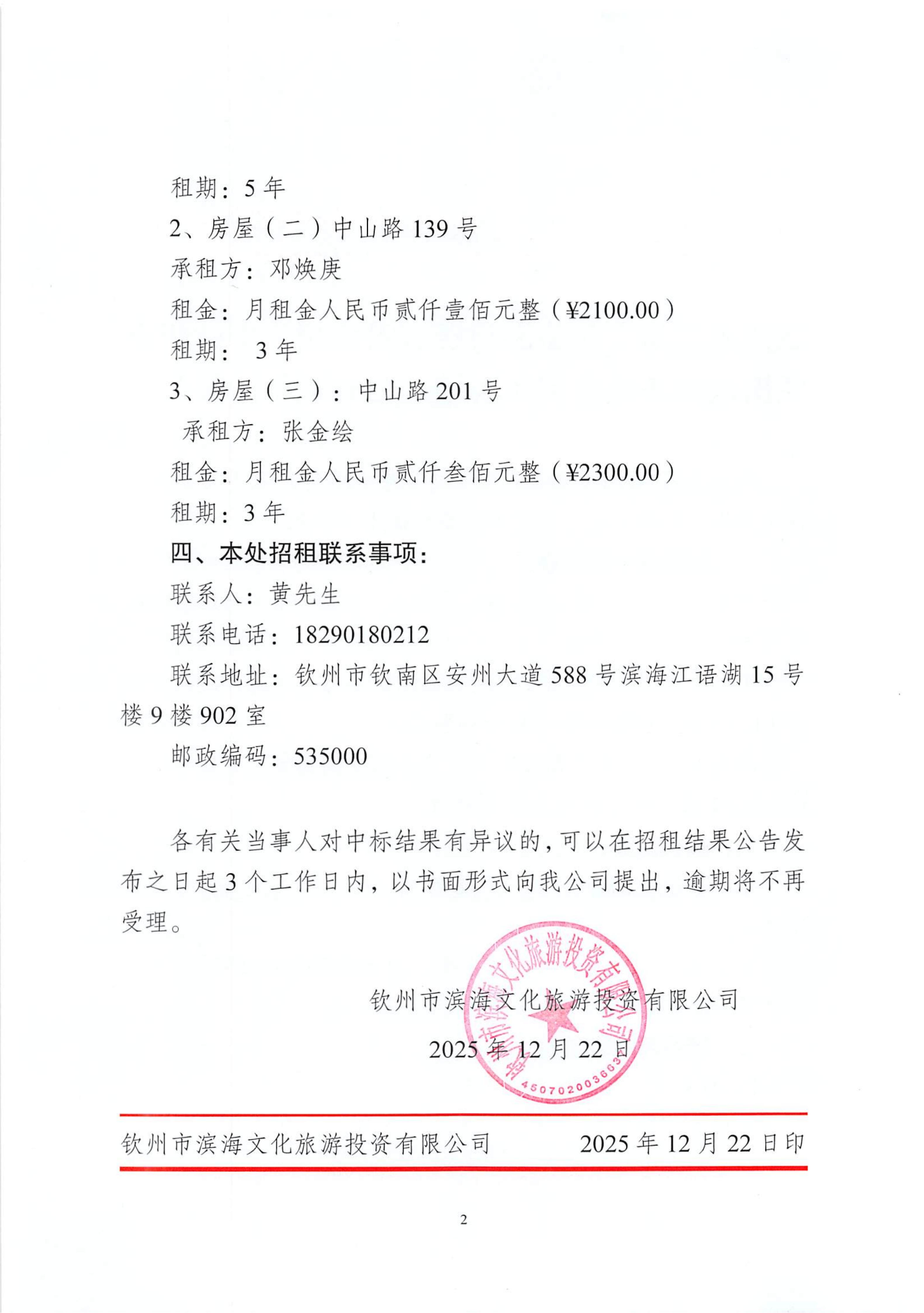 欽州市濱海文化旅游投資有限公司關(guān)于欽州市老街范圍3處房屋(場(chǎng)地)公開招租結(jié)果公示(沙尾街20號(hào)、中山路139號(hào)、中山路201號(hào))