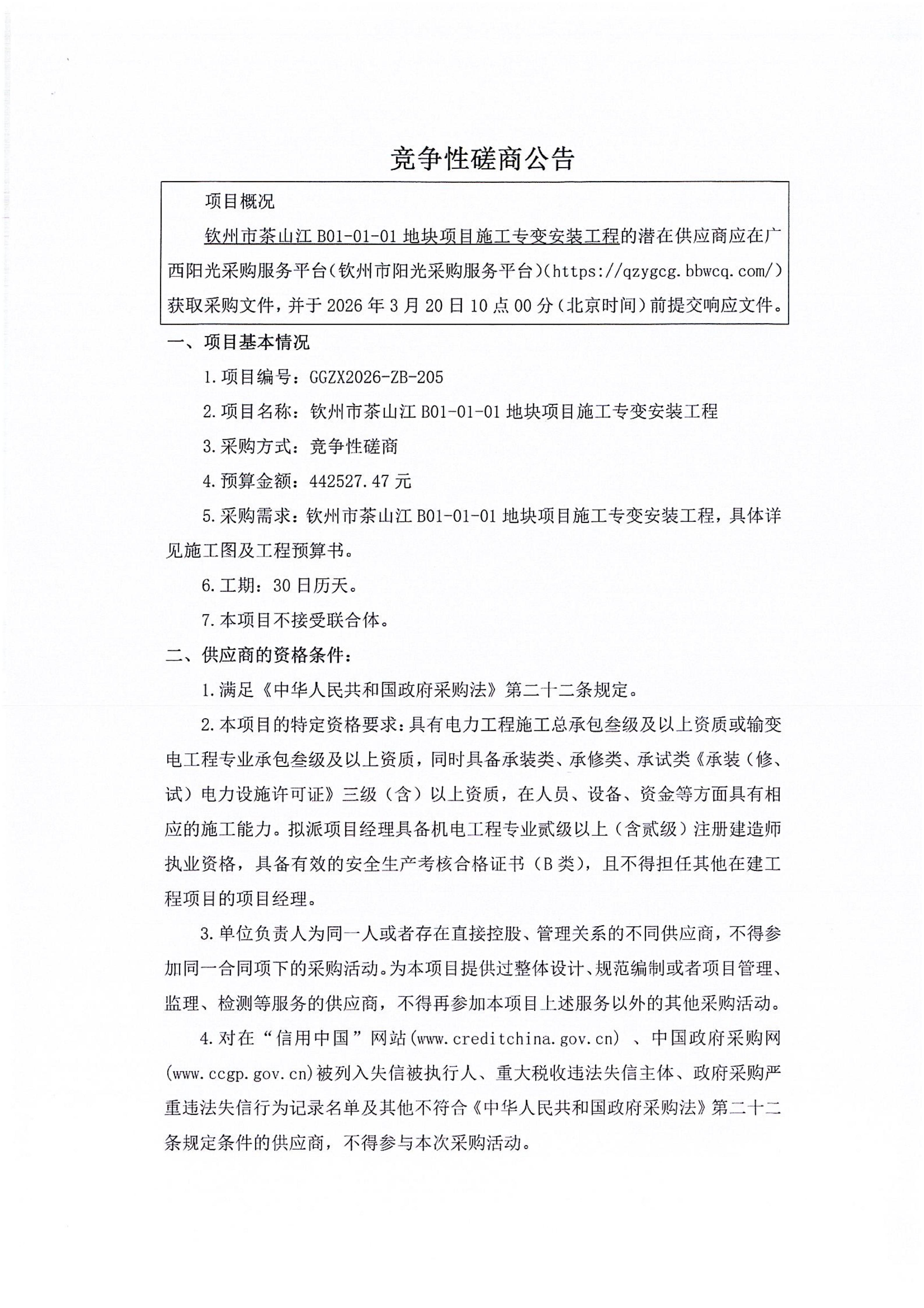 欽州市茶山江B01-01-01地塊項(xiàng)目施工專變安裝工程 競爭性磋商公告