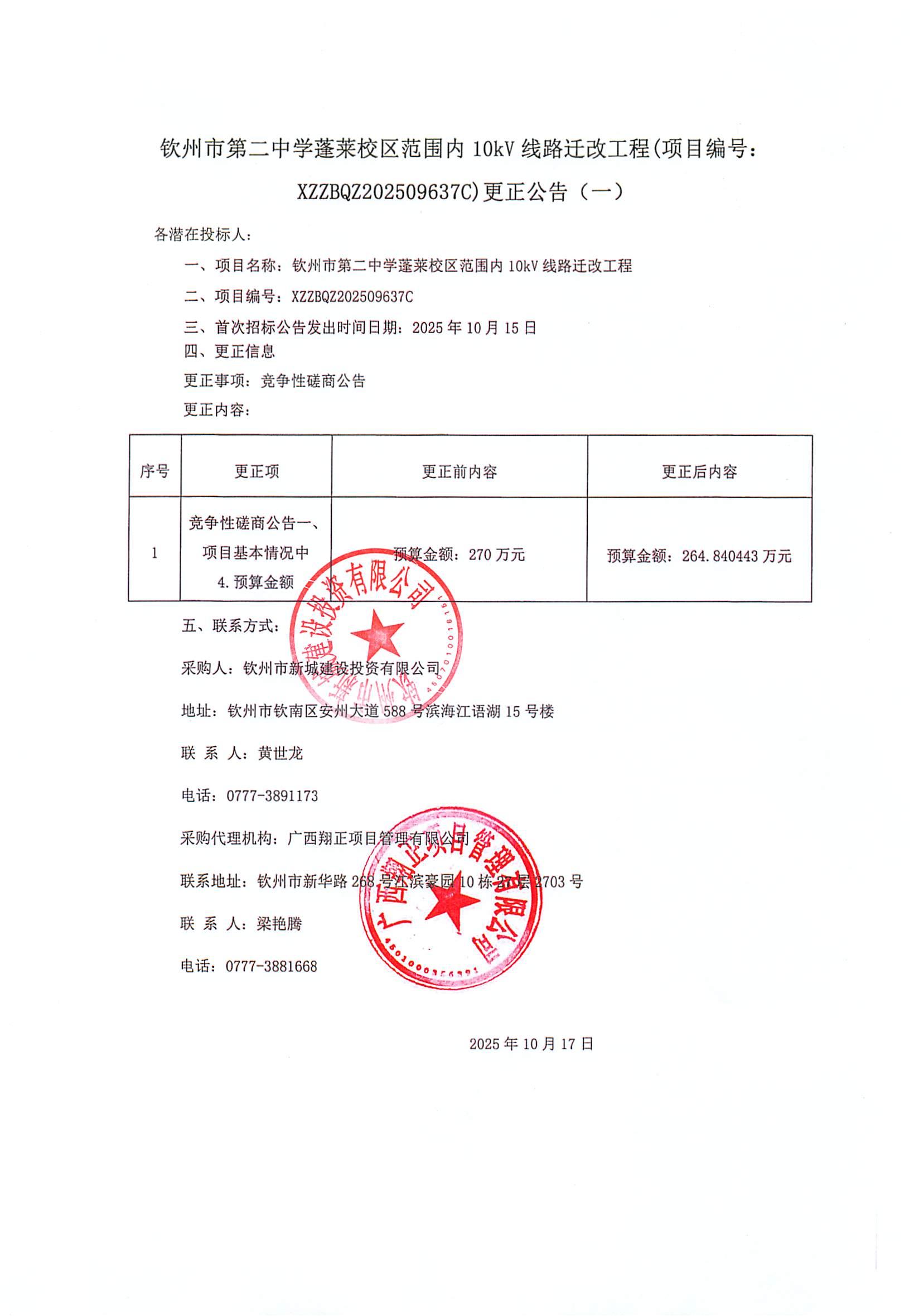 欽州市第二中學(xué)蓬萊校區(qū)范圍內(nèi)10kV線路遷改工程(項(xiàng)目編號(hào): XZZBQZ202509637C)更正公告(一)
