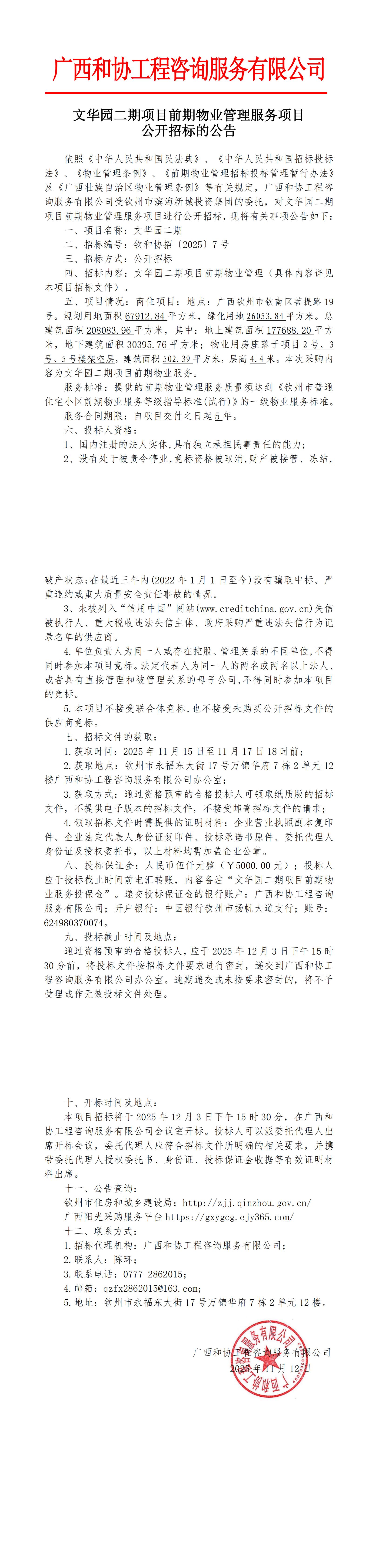 文華園二期項(xiàng)目前期物業(yè)管理服務(wù)項(xiàng)目公開招標(biāo)的公告