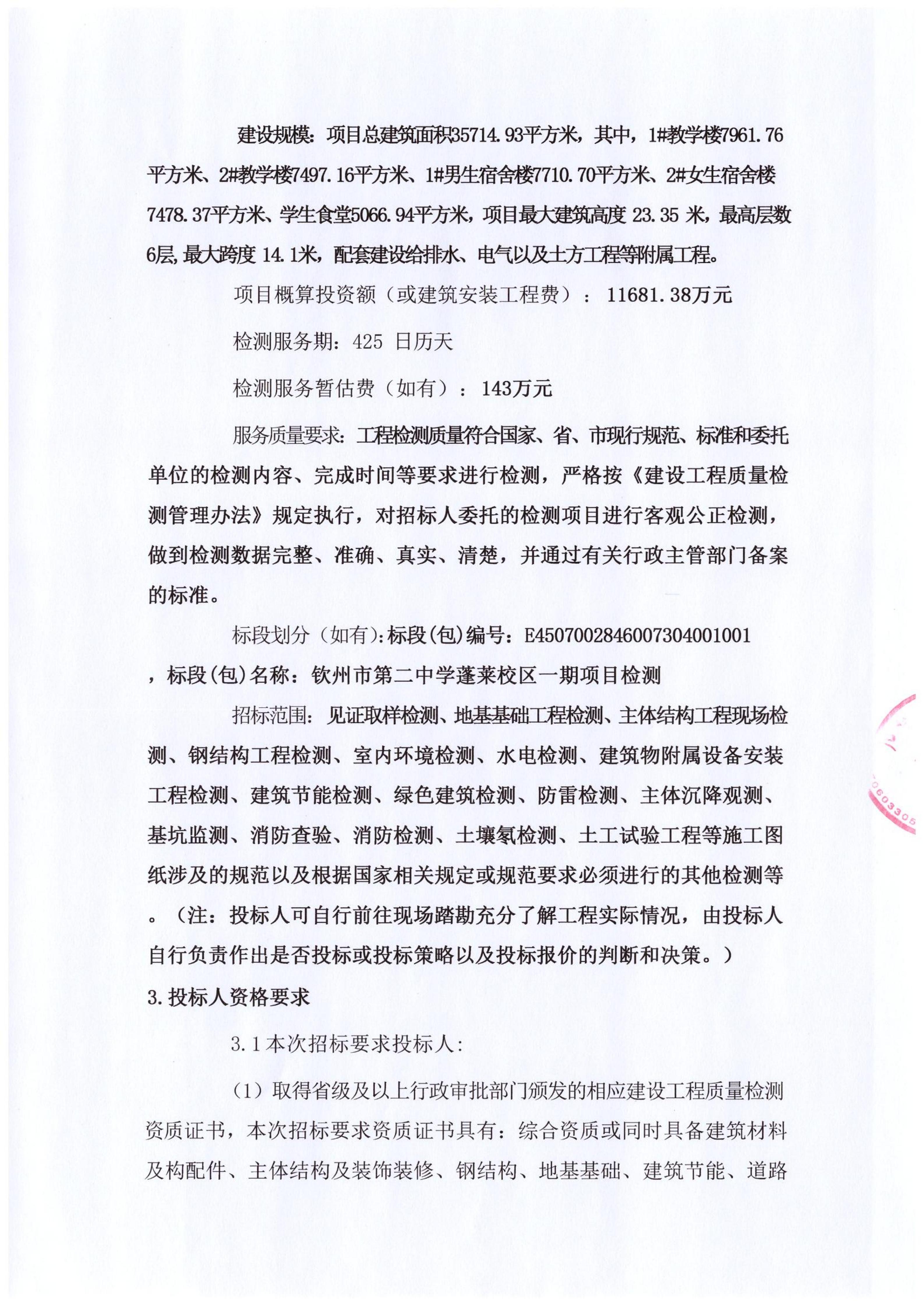 欽州市第二中學蓬萊校區(qū)一期項目檢測工程檢測招標公告