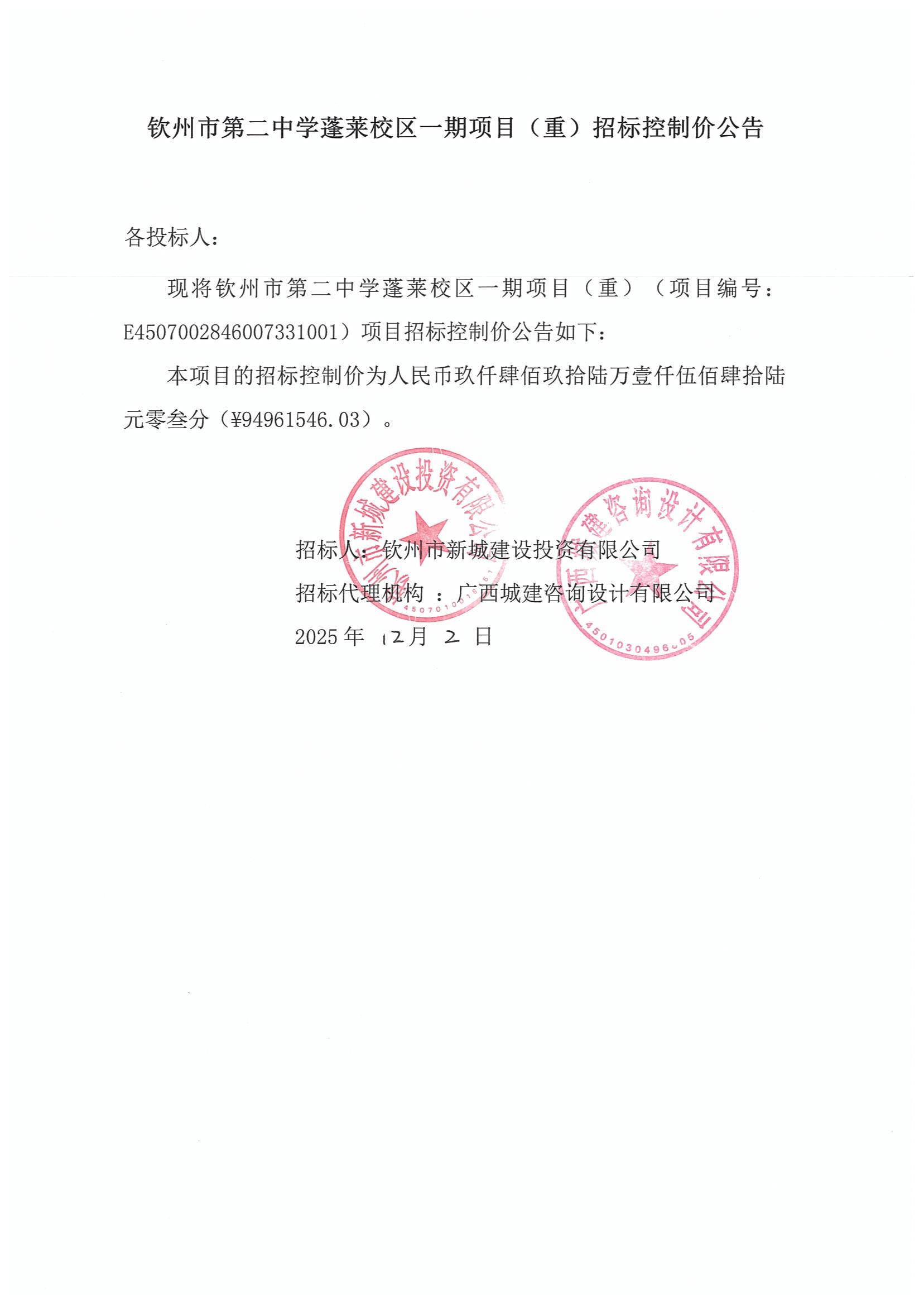 欽州市第二中學蓬萊校區(qū)一期項目(重)招標控制價公告