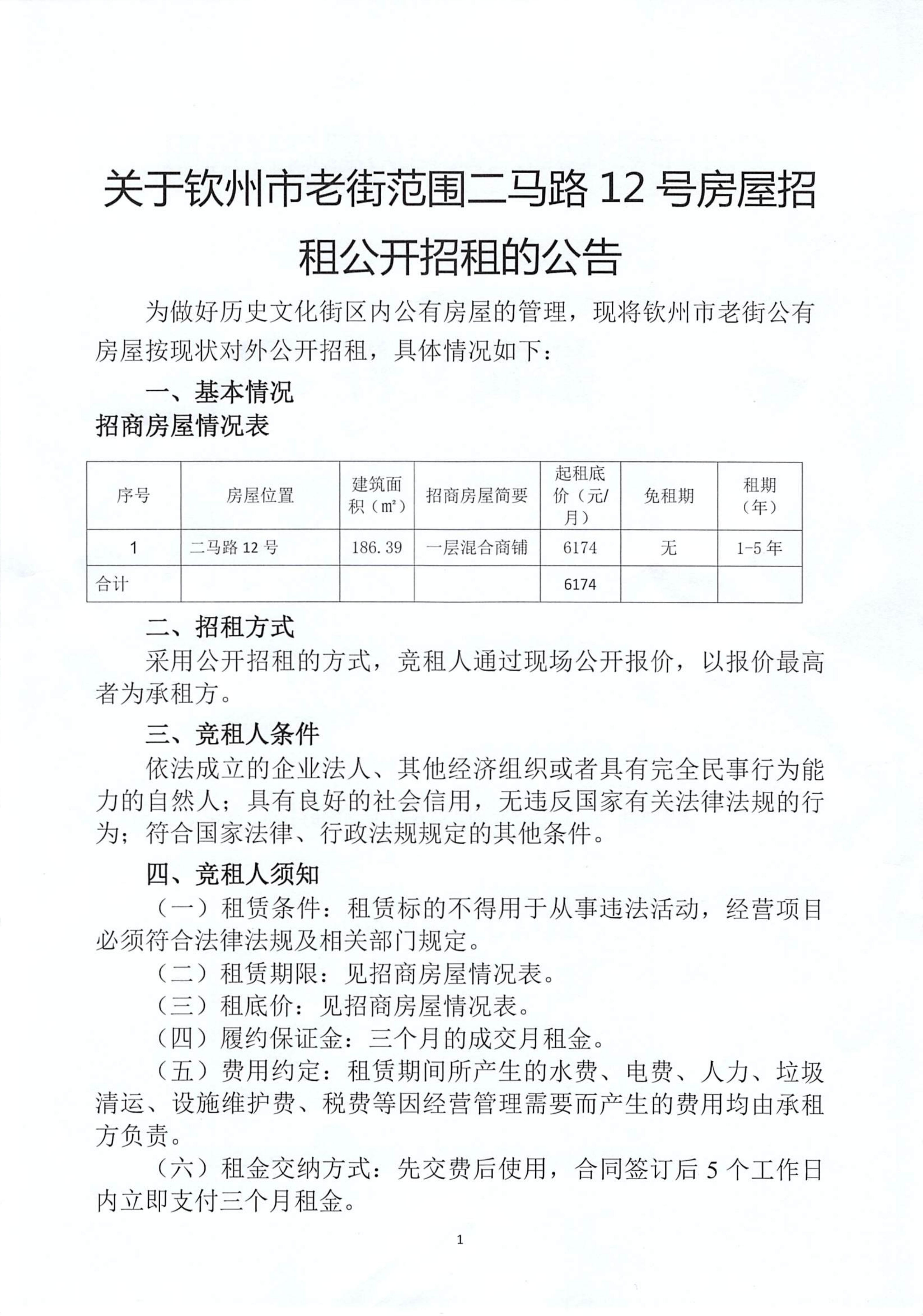 關(guān)于欽州市老街范圍二馬路12號(hào)房屋招 租公開招租的公告